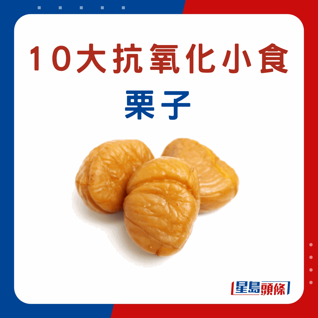 栗子含维他命C、酚类化合物如没食子酸、鞣花酸、单宁、儿茶素等,具有抗氧化的功能。