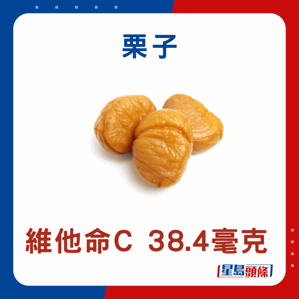 5粒约40克的栗子已有15毫克维他命C,是成年女士每天需要的1/5分量。