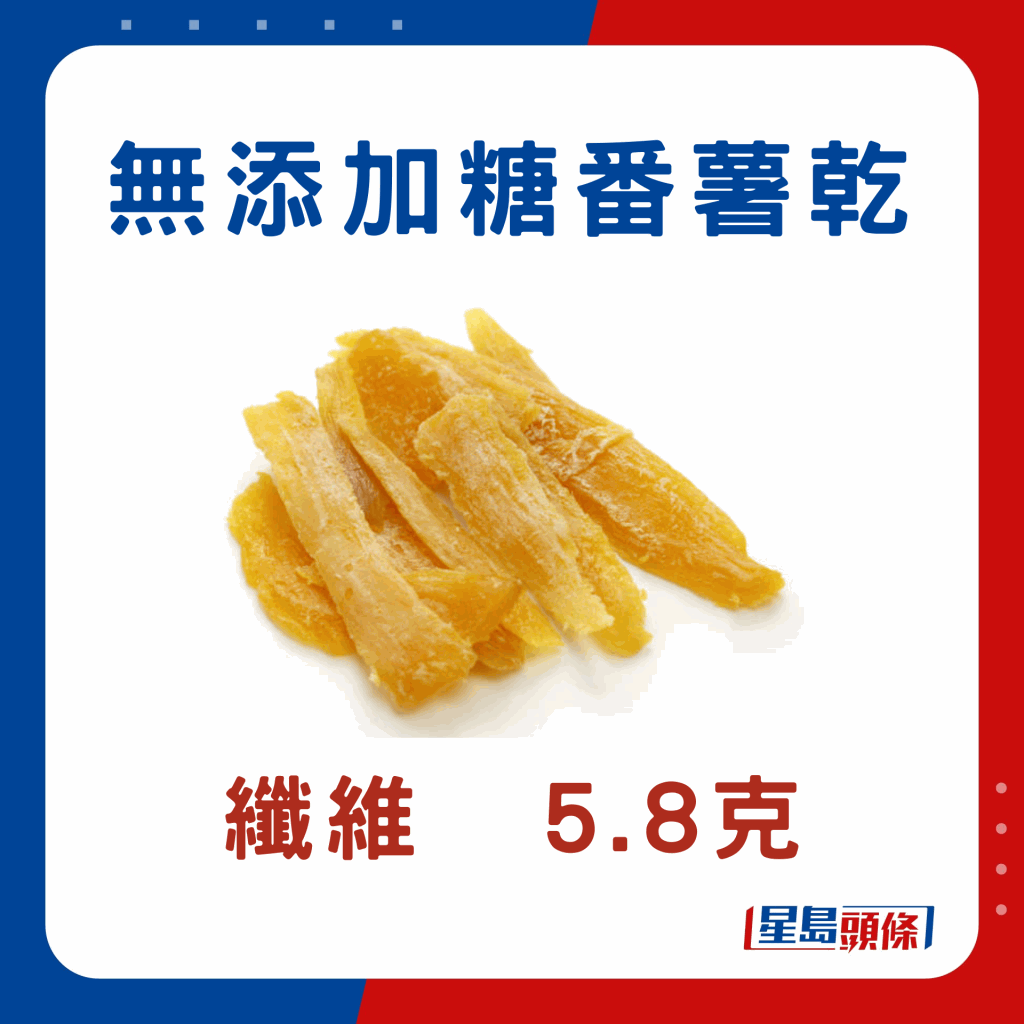 番薯干含丰富纤维,对预防便秘很有功效,加上本身含丰富果糖,能提供天然甜味,非常适合嗜甜人士。