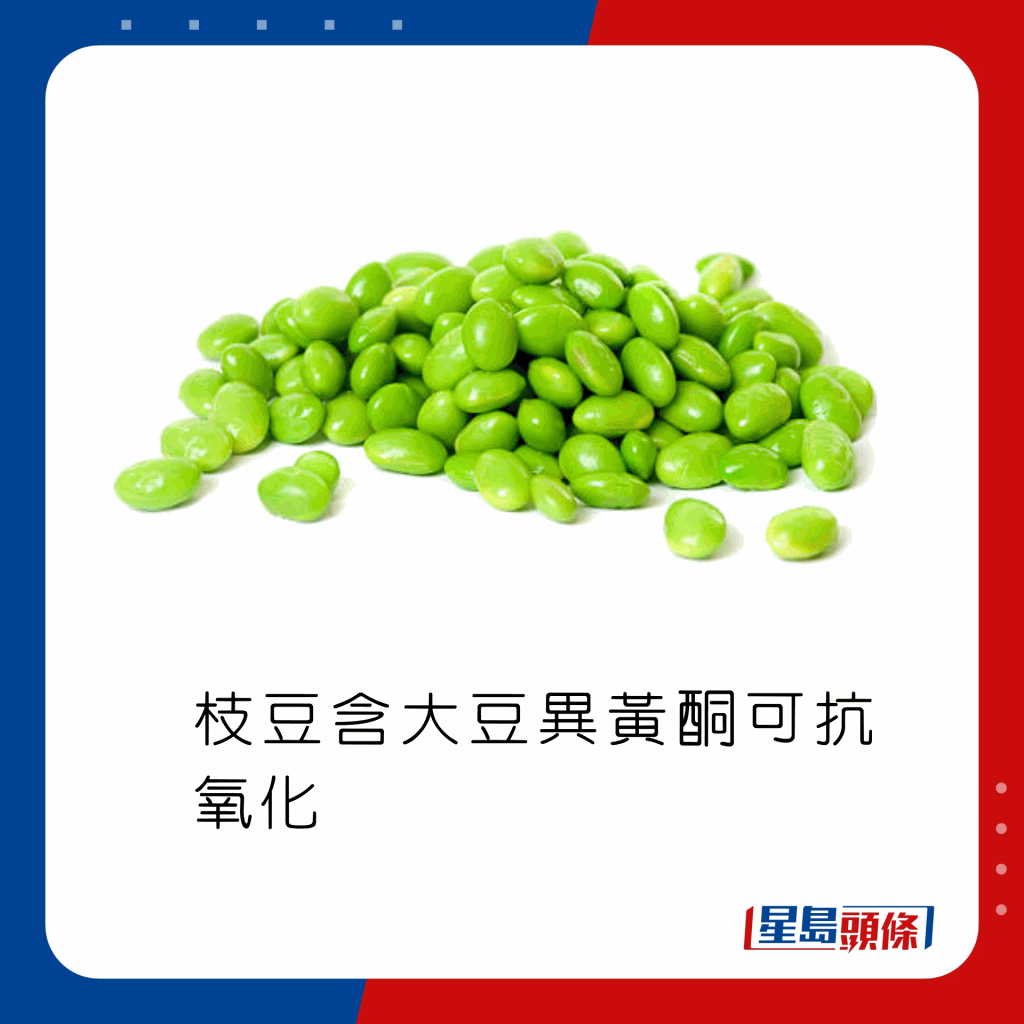 枝豆是大豆未成熟时所采摘的豆莢,与大豆一样,含丰富大豆异黄酮,是多酚的一种,有抗氧化的功效。