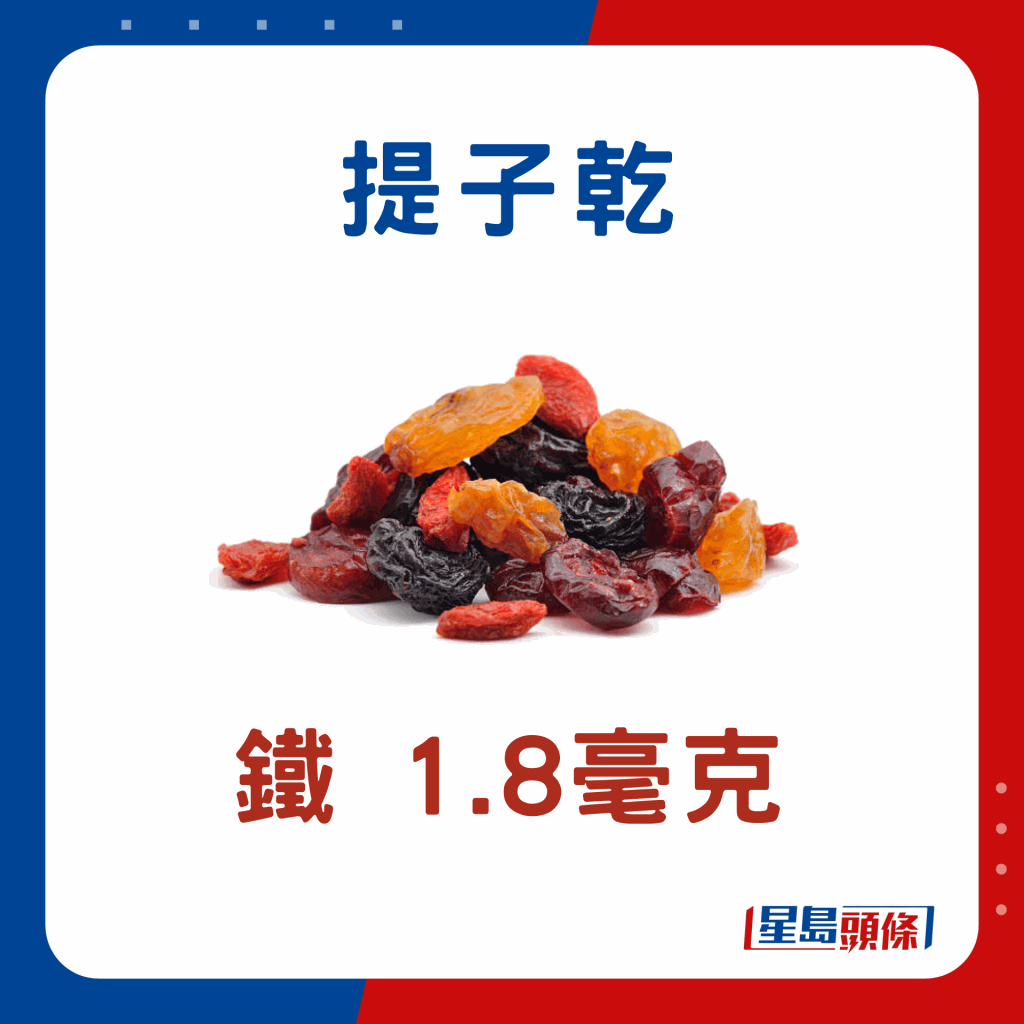 提子干含铁质,不过属植物性的非血红素铁,研究指其吸收率有1至10%,比动物性的血红素铁的(25%至30%)低