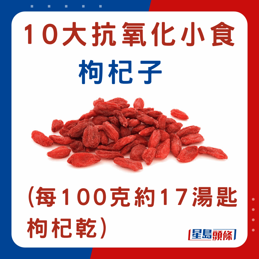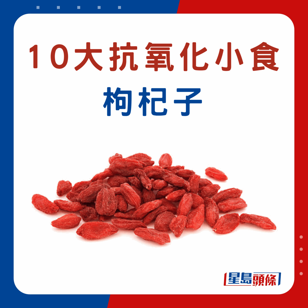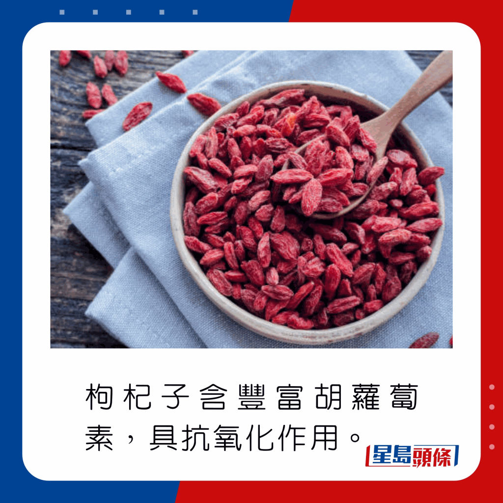枸杞子含丰富胡萝卜素、酚类化合物、类黄酮,具抗氧化抗衰老及防癌的作用。