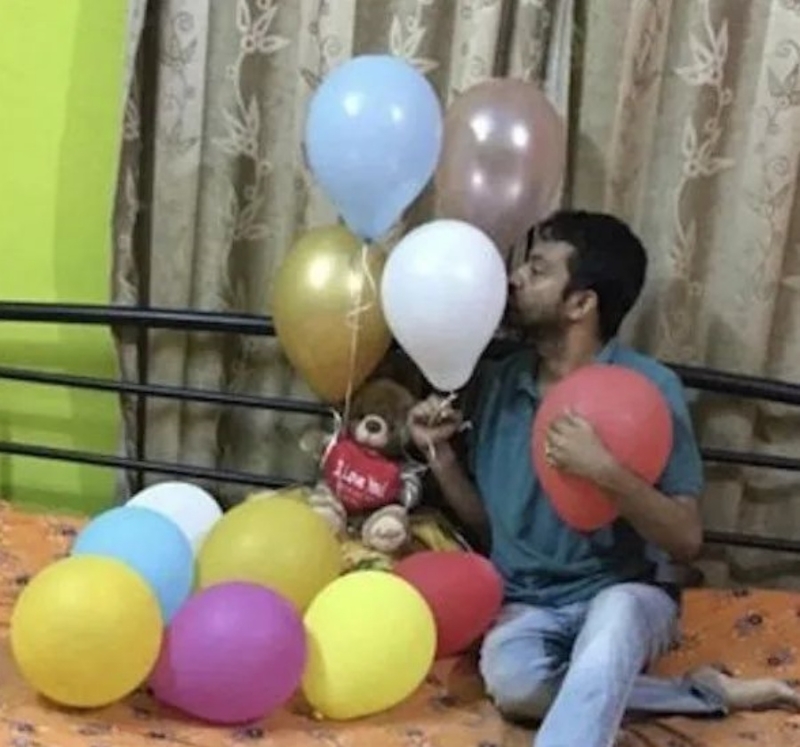 28岁的马宗达(Aakash Majumdar)表示,起初他对气球只有友情,后来慢慢发展成更深层次的一种关系,甚至开始与之同床共枕,至两年前单膝跪地向气球求婚“我们的爱如此强烈,我不能没有它!”。