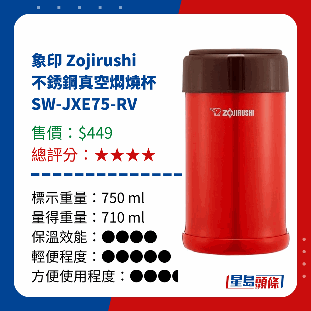 “象印Zojirushi”不锈钢真空焖烧杯SW-JXE75-RV($449)