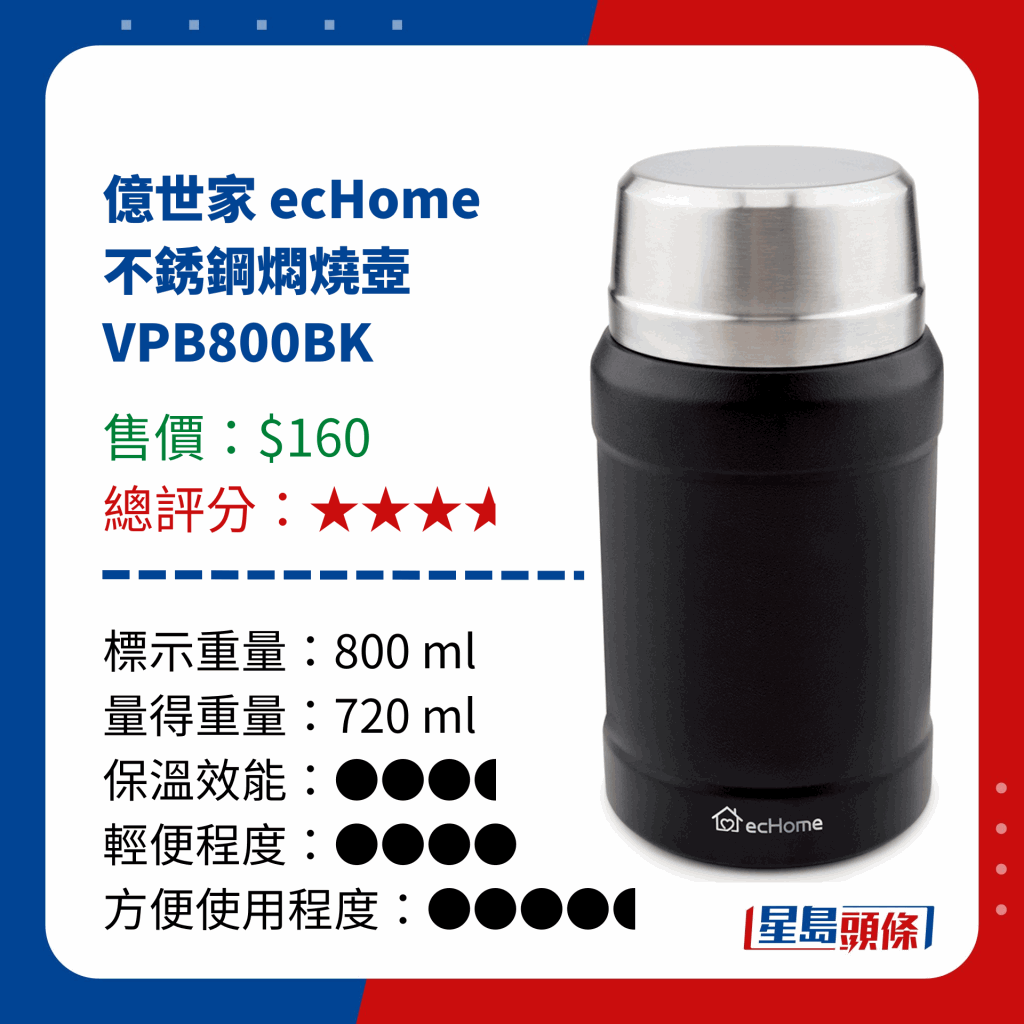 “亿世家ecHome”不锈钢焖烧壶VPB800BK($160)