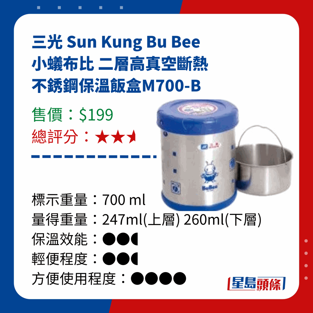 “三光牌Sun Kung”BuBee小蚁布比二层高真空断热不锈钢保温饭盒M700-B($199)