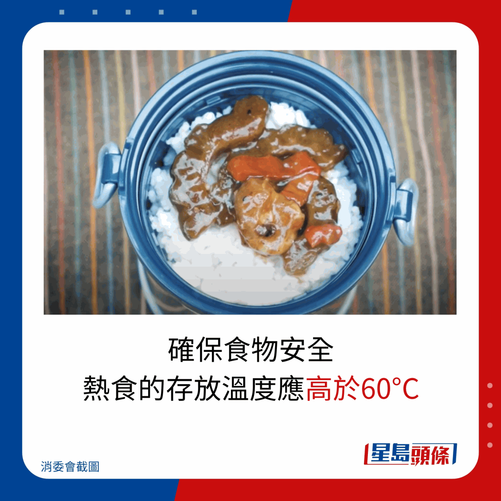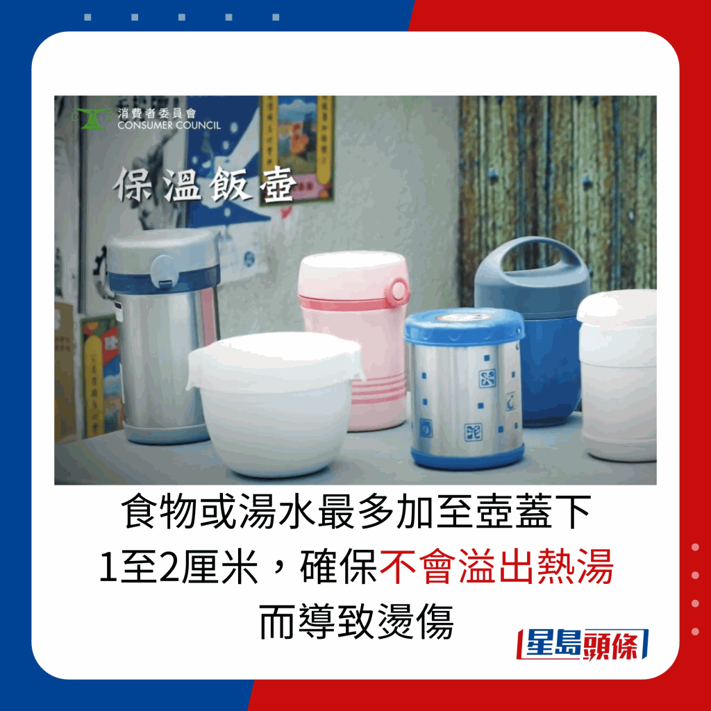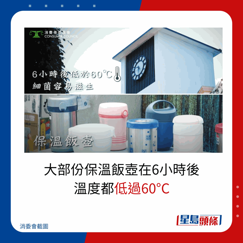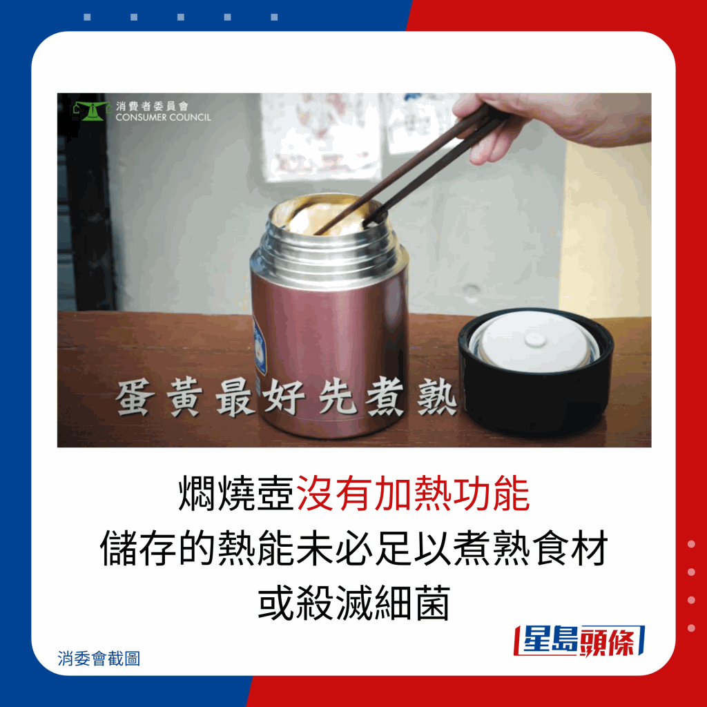 消委会提醒市民,大部份保温饭壶在 6 小时后,温度都低过 60°C,最好在 6小时内尽快食用。即使未能一次吃完,也不应保留稍后再吃,以避免食物安全风险。另外焖烧壶没有加热功能,消费者宜预先煮熟食材,尤其是鸡蛋、肉类、海产、菇类等生鲜食材,才放入壶内继续焖焗。