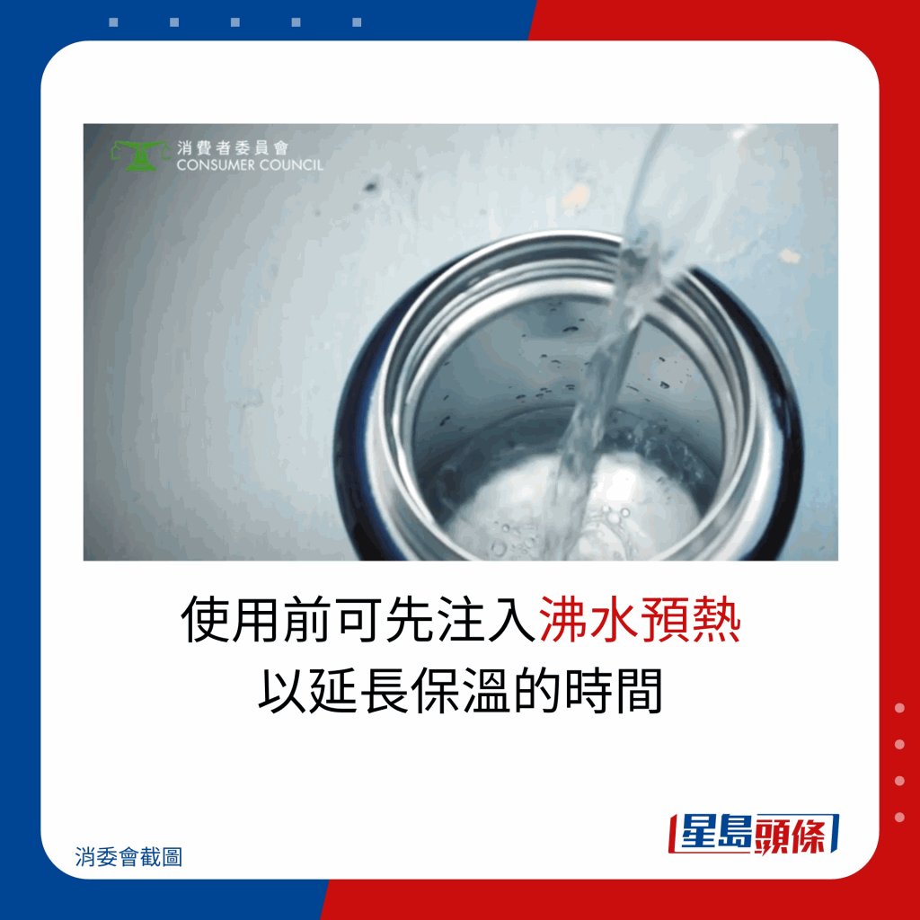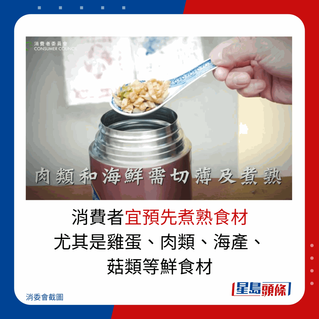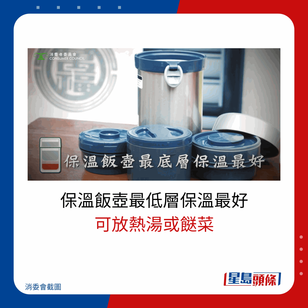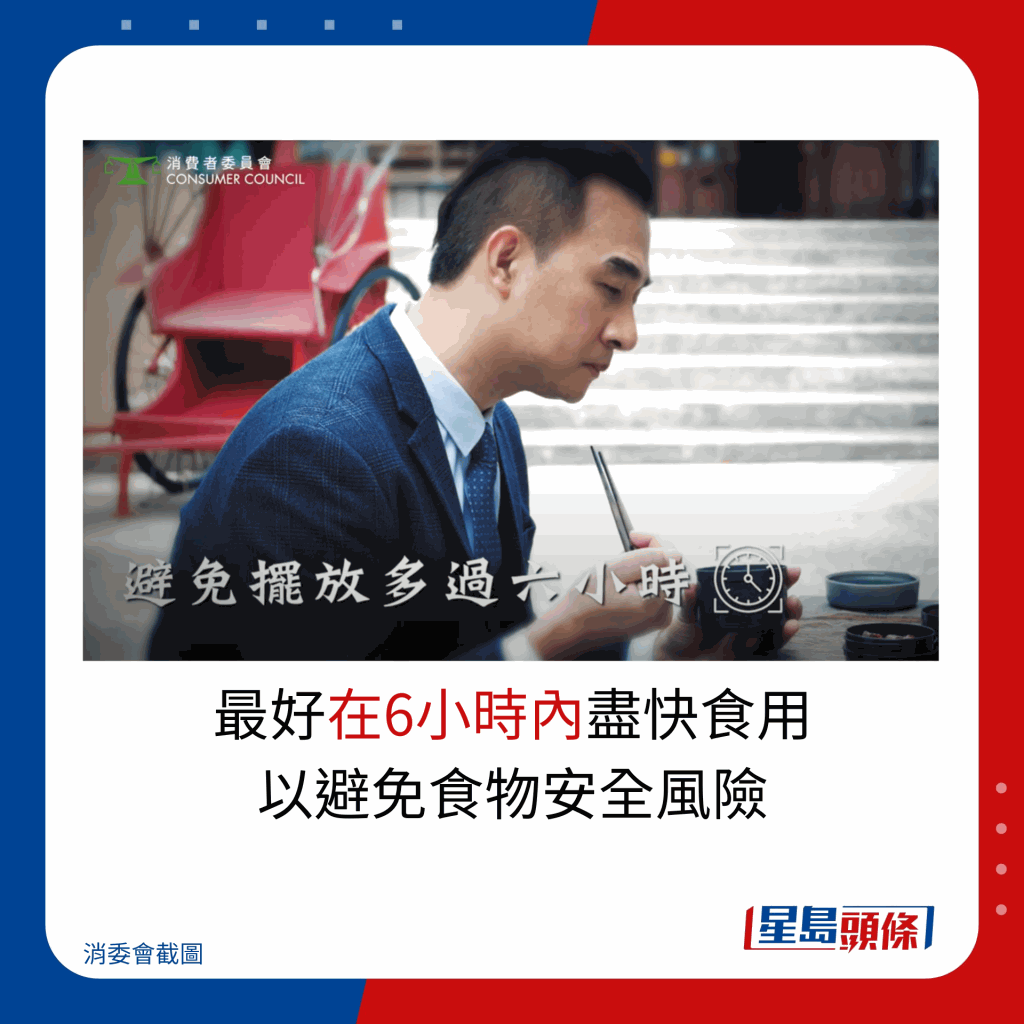 消委会提醒市民,大部份保温饭壶在 6 小时后,温度都低过 60°C,最好在 6小时内尽快食用。即使未能一次吃完,也不应保留稍后再吃,以避免食物安全风险。另外焖烧壶没有加热功能,消费者宜预先煮熟食材,尤其是鸡蛋、肉类、海产、菇类等生鲜食材,才放入壶内继续焖焗。