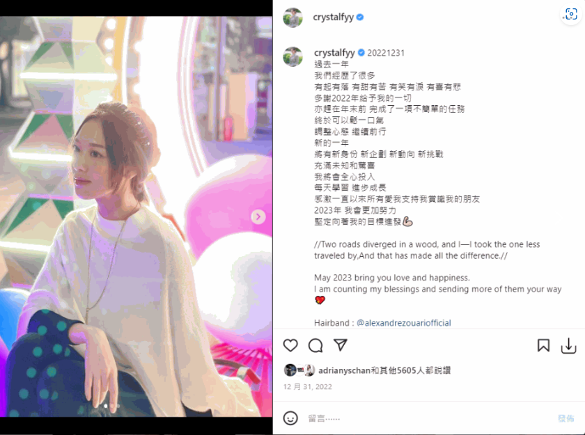 冯盈盈在2022年的最后一天,她在IG留言称过去一年经历了很多,有起有落、有甜有苦;有笑有泪、 有喜有悲,预告赶在2022年末前,完成了一项不简单的任务,令她终于可以松一口气:“调整心态,继续前行,新的一年,将有新身份,新企划,新动向,新挑战,充满未知和惊喜。”她又称自己将会全心投入,每天学习,进步成长:“感激一直以来所有爱我支持我赏识我的朋友,2023年,我会更加努力,坚定向着我的目标进发。”
