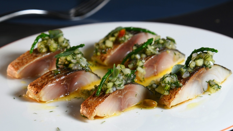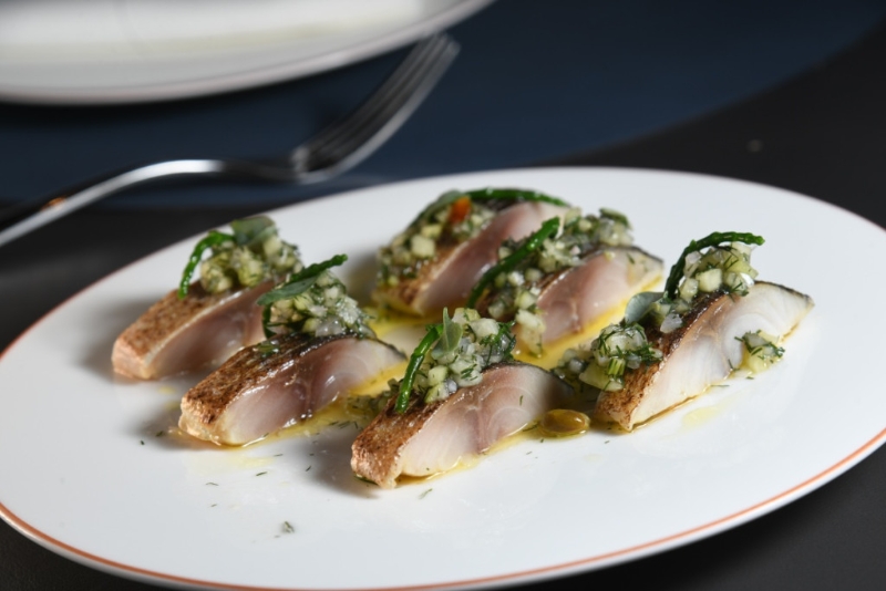 ▲腌日本鲭鱼,鲭鱼调味后,在上碟前轻轻用火烧出鱼油的味道,配上清新爽脆的青瓜粒、丝瓜柳及莳萝,鲜美丰腴。