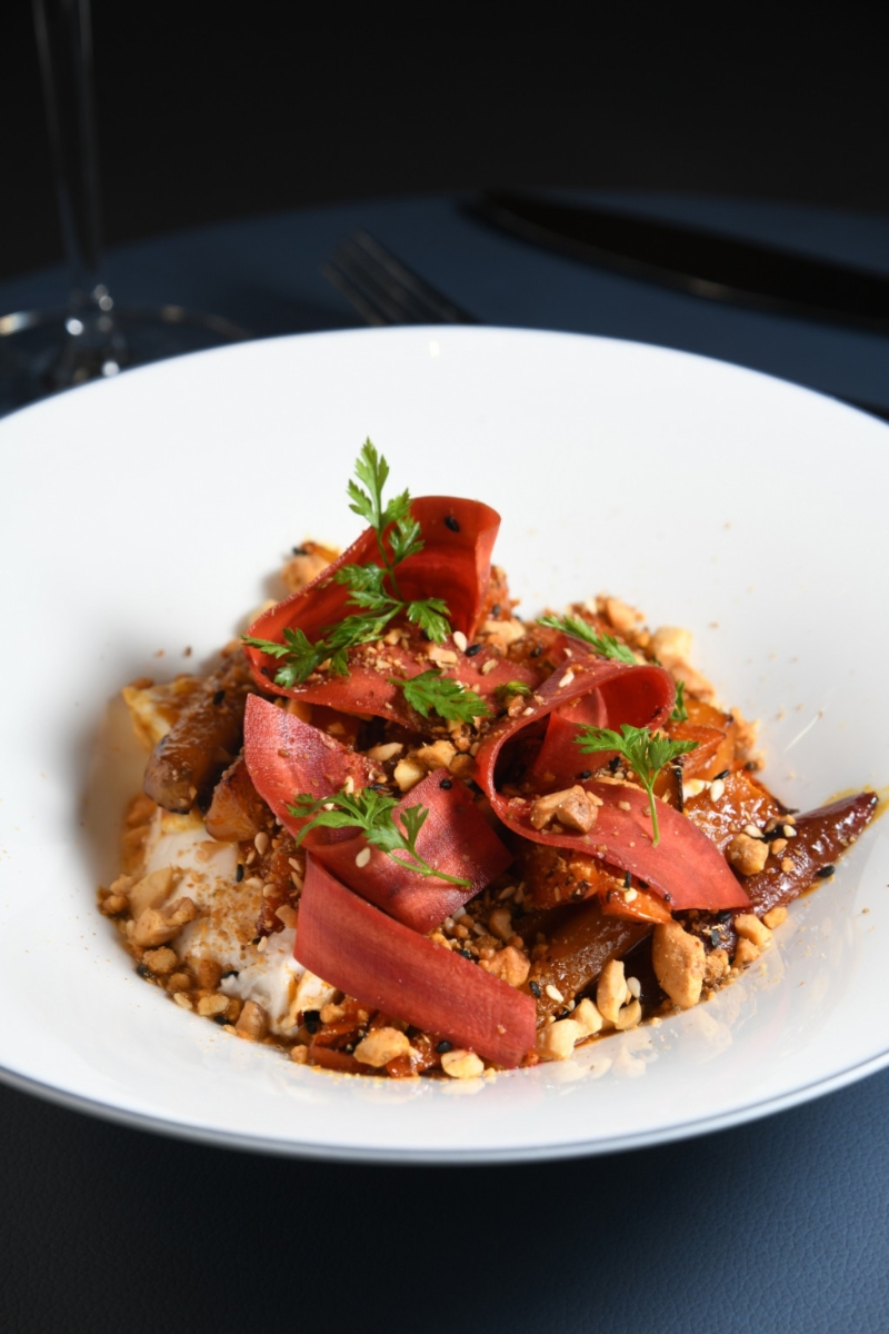▲腌胡萝卜,胡萝卜简单腌制后稍微煎烤,伴鲜胡萝卜汁、意式香醋、蜂蜜制成的酱汁,以及椰子酸奶、酸渍萝卜片,酸香可口。