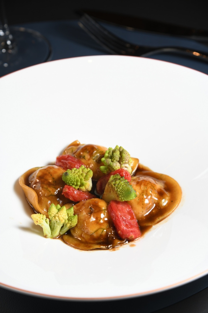 ▲小龙虾云吞,云吞内是整只小龙虾尾与带子慕斯,淋上香浓小龙虾汁,另配风干鲜茄及罗马青花菜,口感丰富。