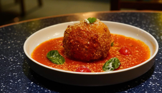 喜欢布拉塔芝士的食客定不能错过香炸布拉塔芝士,布拉塔芝士共炸2次,用外面嘅热力慢慢融化包裹着嘅芝士,上碟前炸一次炸至金黄色,外皮香脆,内里则保留着芝士软绵幼滑细腻的口感,奶香十足,配上番茄罗勒酱,清新中带点香甜。