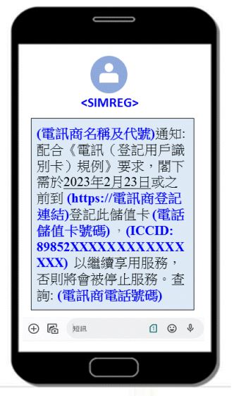 ▲电讯商在登记限期前已向尚未完成登记的“太空卡”用户发出最后 “登记提示短讯”范本。政府新闻处