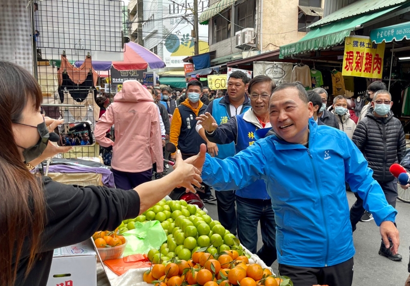 ▲新北市长侯友宜26日(右)与“立委”补选候选人林明溱(右二),到竹山镇菜市场扫街拜票。中国时报