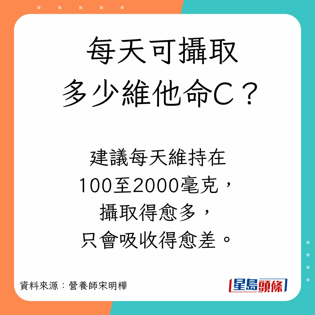 每天可摄取多少维他命C? 服用多少为之过量? 她讲解如下: