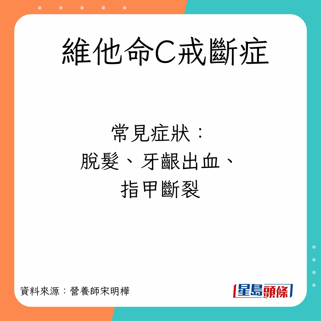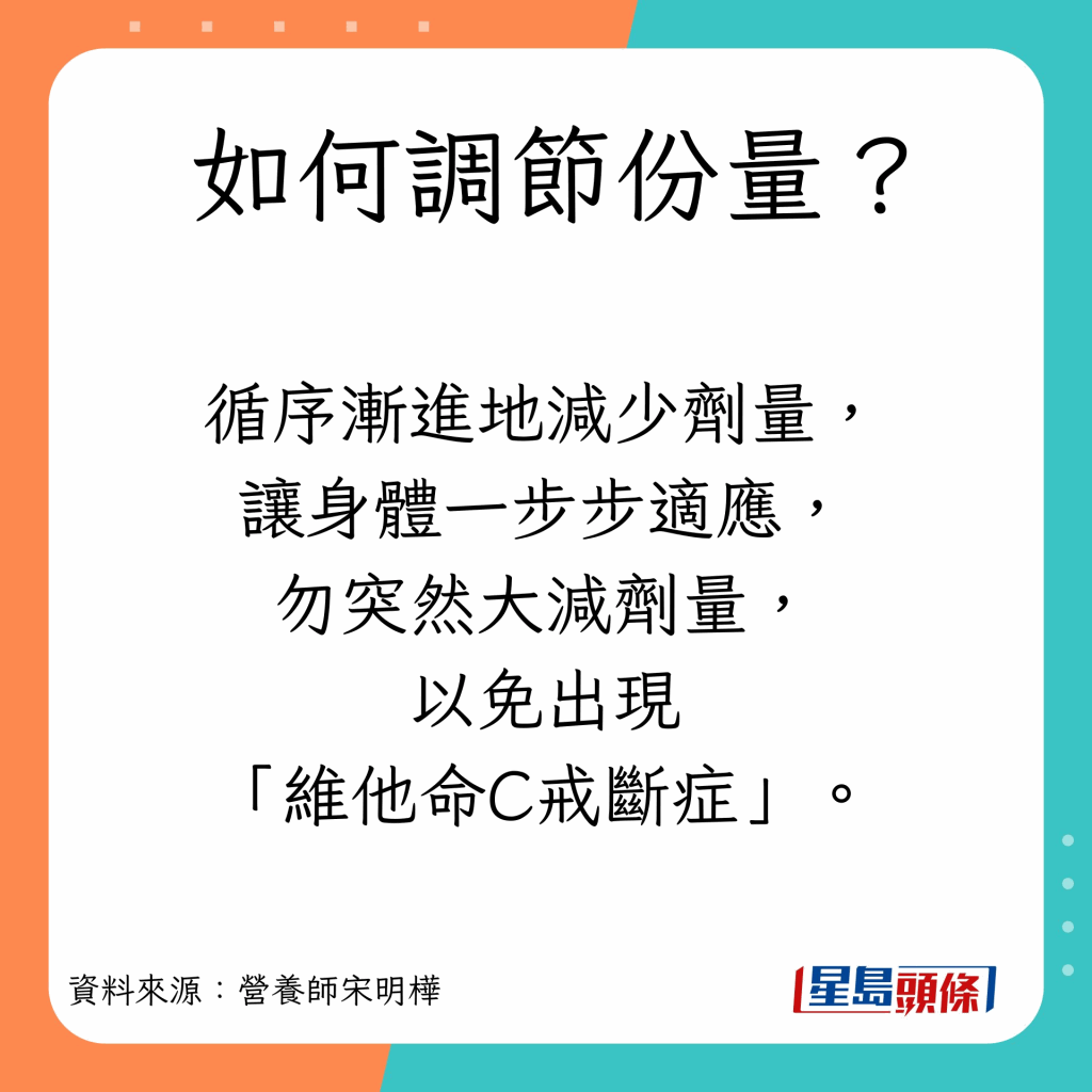台湾营养师宋明桦表示不少人以为维他命C摄取过多,就会自然排出体外,但其实不然; 服用过多只会增加肾脏负担,带来反效果。 若身体长时间泡在维他命C里面,突然大量减少,一下子被抽掉的话,身体就会觉得缺乏,继而出现维他命C戒断症。
