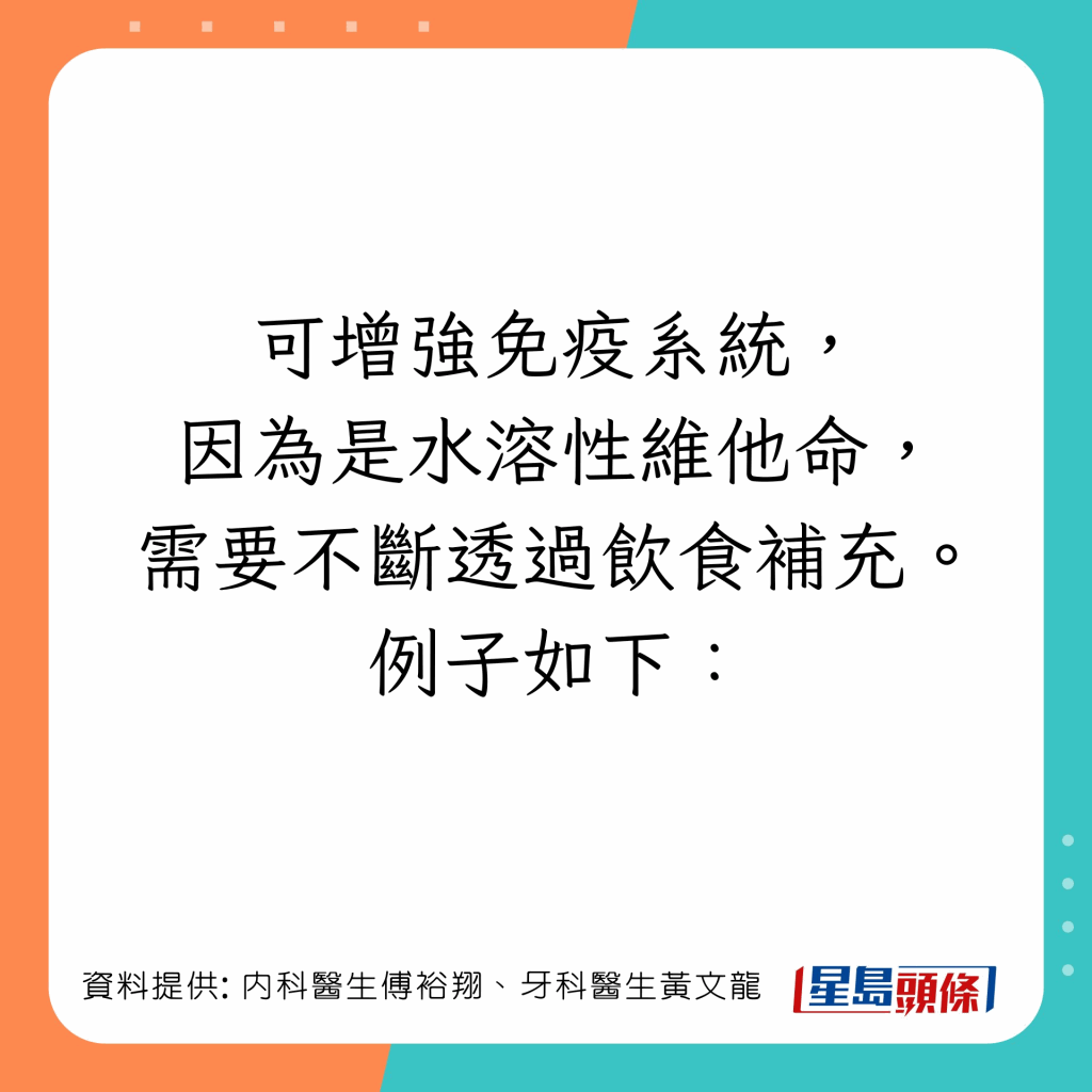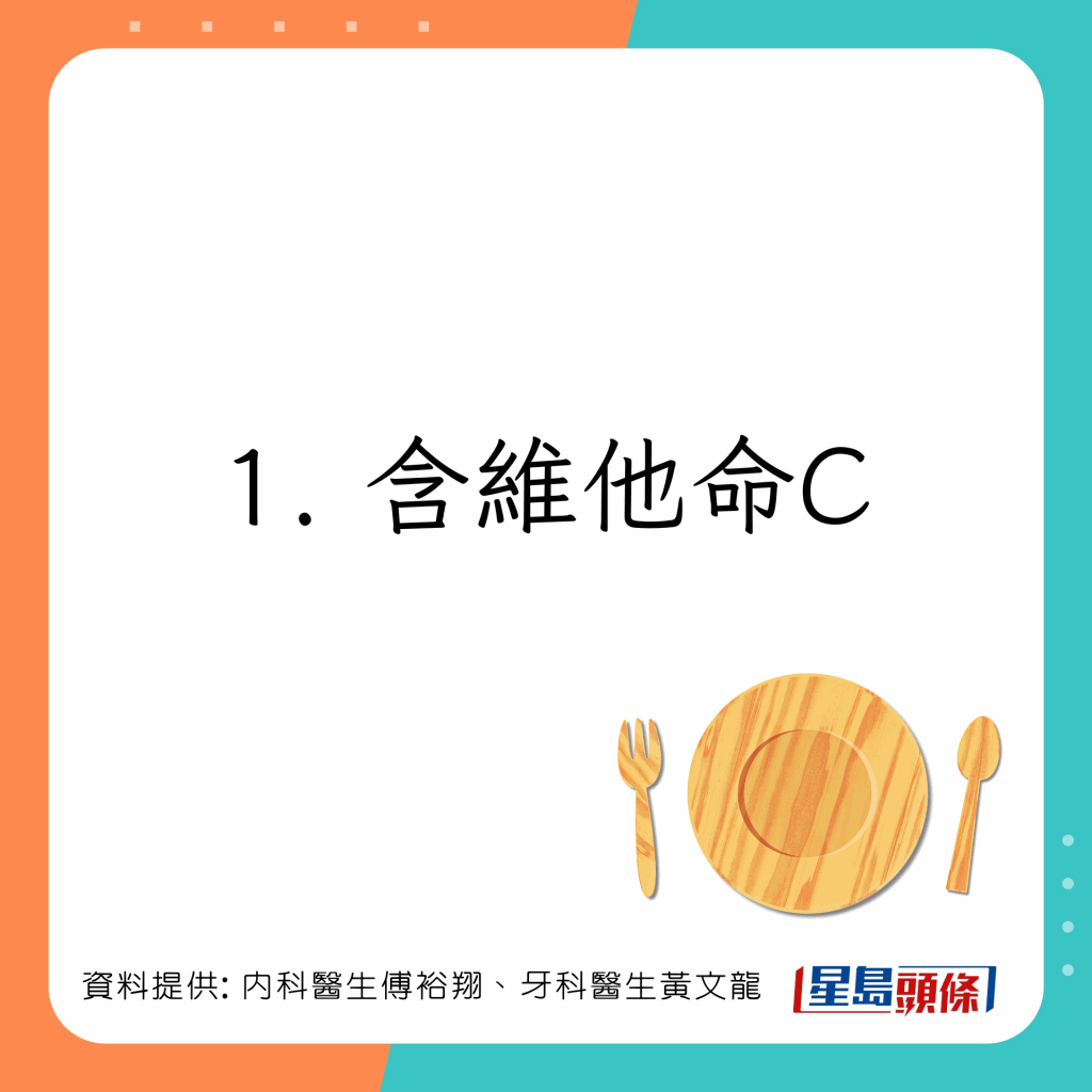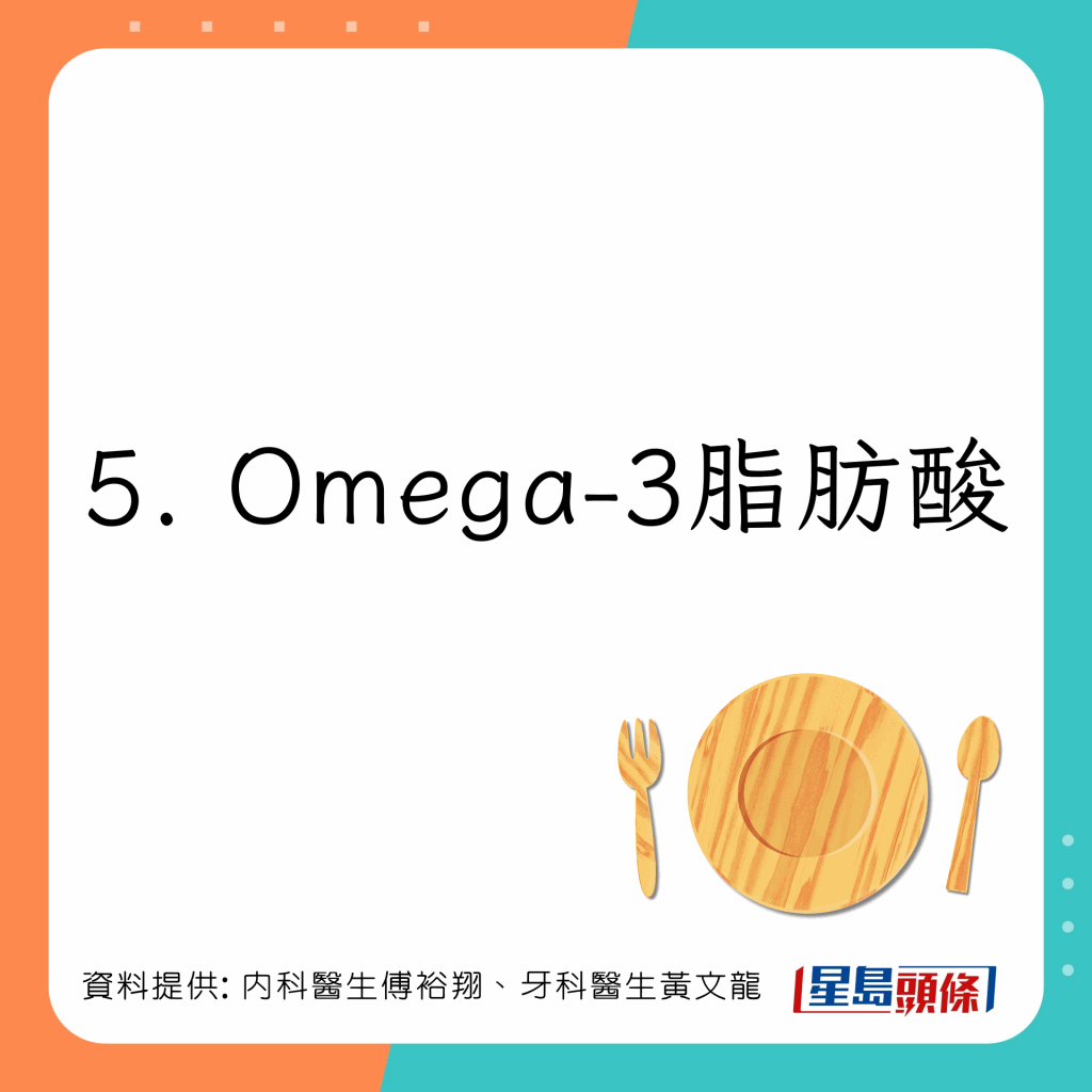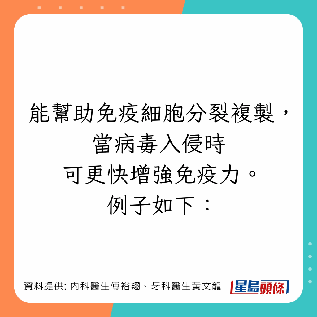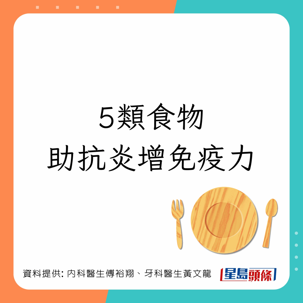 台湾内科医生傅裕翔及牙科医生黄文龙于Facebook专页上发文,列出5类有助增强免疫力及抗发炎的食物: