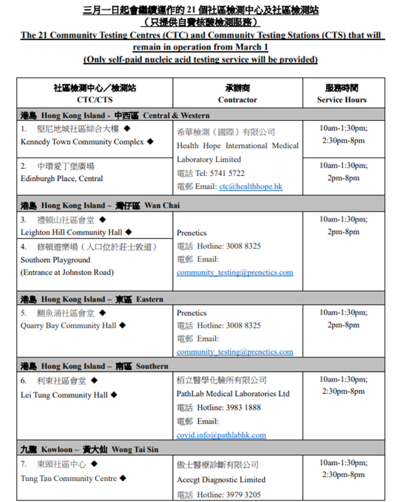 3月1日起,公立医院、安老院及残疾人士院舍的员工、探访人士及院舍住客的核酸检测要求由星期三(3月1日)起以快速抗原测试取代。社区检测网络的免费核酸检测服务同日起会停止。