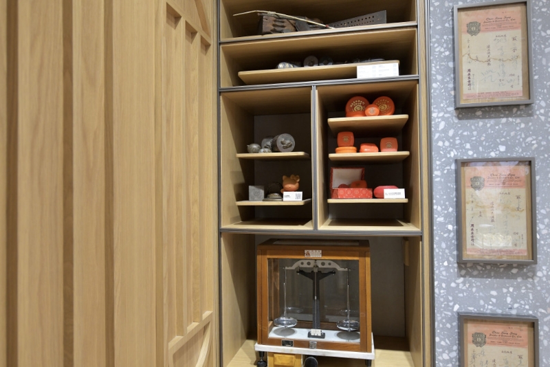 ▲店内特设历史展品区,摆设了品牌昔日用来打金的工具,及珠宝单据等