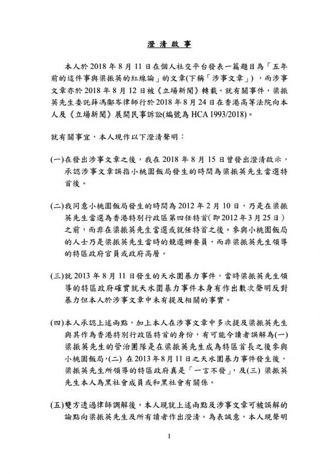 钟剑华今早在社交网贴出“澄清启事”,指涉事文章引述的时间和人物等基本事实有误,有可能令读者误解“梁振英本人为黑社会成员或和黑社会有关系”,并声明会将涉事文章撤回,保证不会以任何方式于任何平台再次发表,同时向梁振英支付10万港元和解金。梁振英的代表律师确认收到钟剑华的和解金,以及另外一笔讼费赔偿。