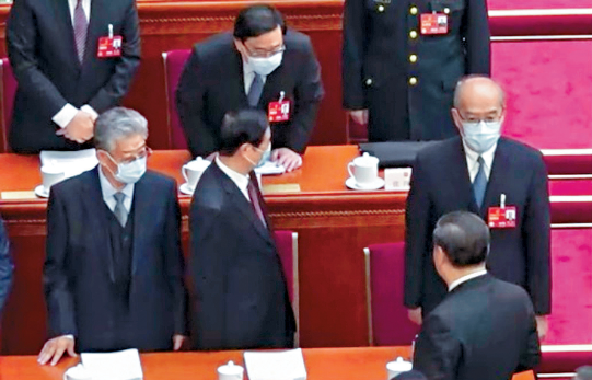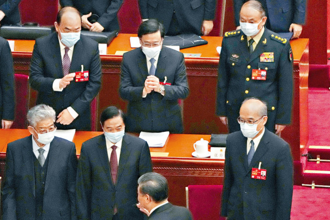 香港行政长官李家超5日到北京列席人大开幕。会议结束各人离场时,国家主席习近平行经李家超附近,稍停下来指向李家超主动打招呼,李家超作揖回礼,并向习近平后方的总理李克强挥手打招呼。李家超旁边的澳门行政长官贺一诚,亦向习近平和李克强作揖及挥手打招呼。