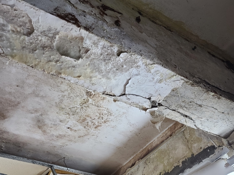 ▲单位内的假天花倒塌后,可以看到天花的钢筋外露。