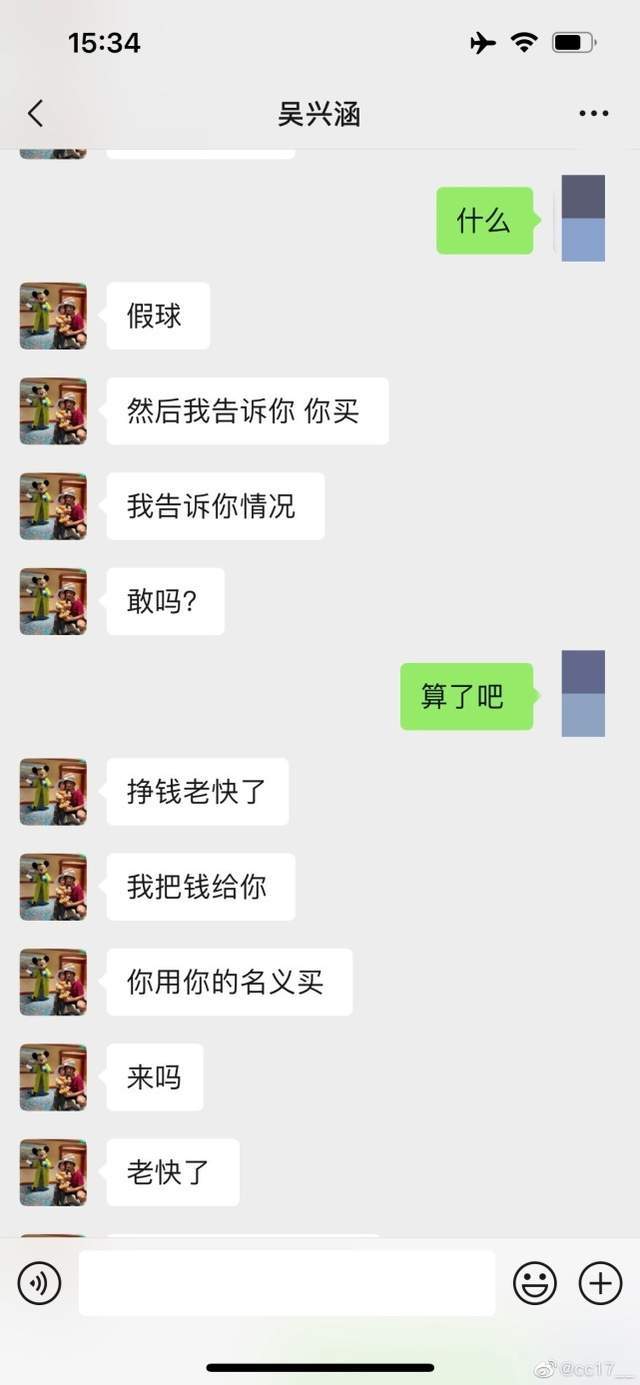 陈晨日前还表示,会向足协、国家体育总局、中央纪委、湖北纪委、税务局、出入境管理局等相关部门进行实名举报。她还配上与吴兴涵的聊天纪录截图,截图中可以看到,吴兴涵表示中国超级球横行,目前中国超级球都是假球。吴兴涵也催促女主参加赌博。一场能赚30、40万元人民币,比正经踢波好得多。