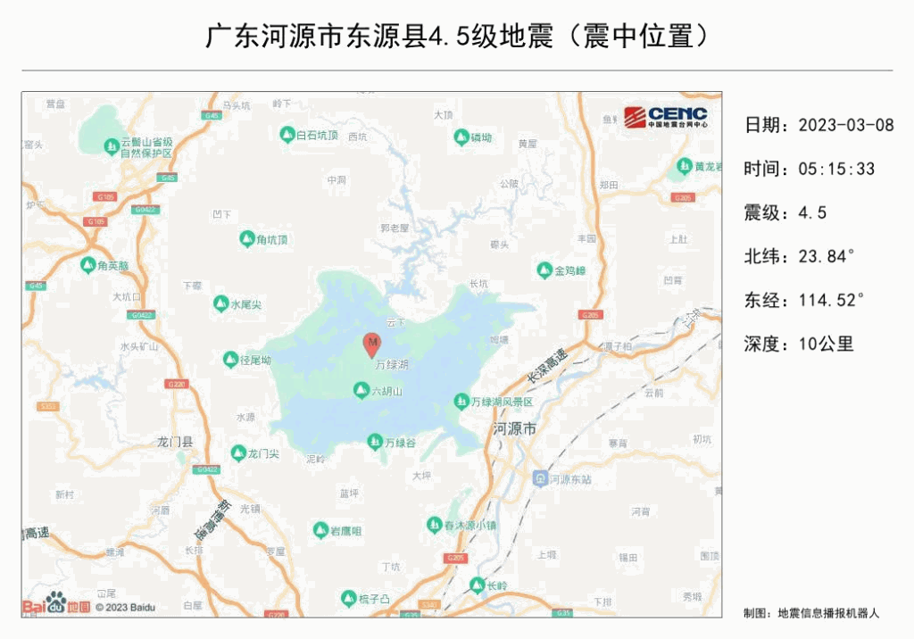 据中国地震台网测定,3月8日5时15分在广东河源市东源县发生4.5级地震,震源深度10公里,震央位于北纬23.84度,东经114.52度。此次震央位于新丰江水库,距河源市区21公里,距广州市150公里。地震造成当地震感强烈,广州、深圳等地有感,无破坏发生。广东多地网友表示有震感,东莞很多人凌晨被震醒,“感觉摇晃了有5秒左右”还有不少东莞市民收到了地震预警信息。