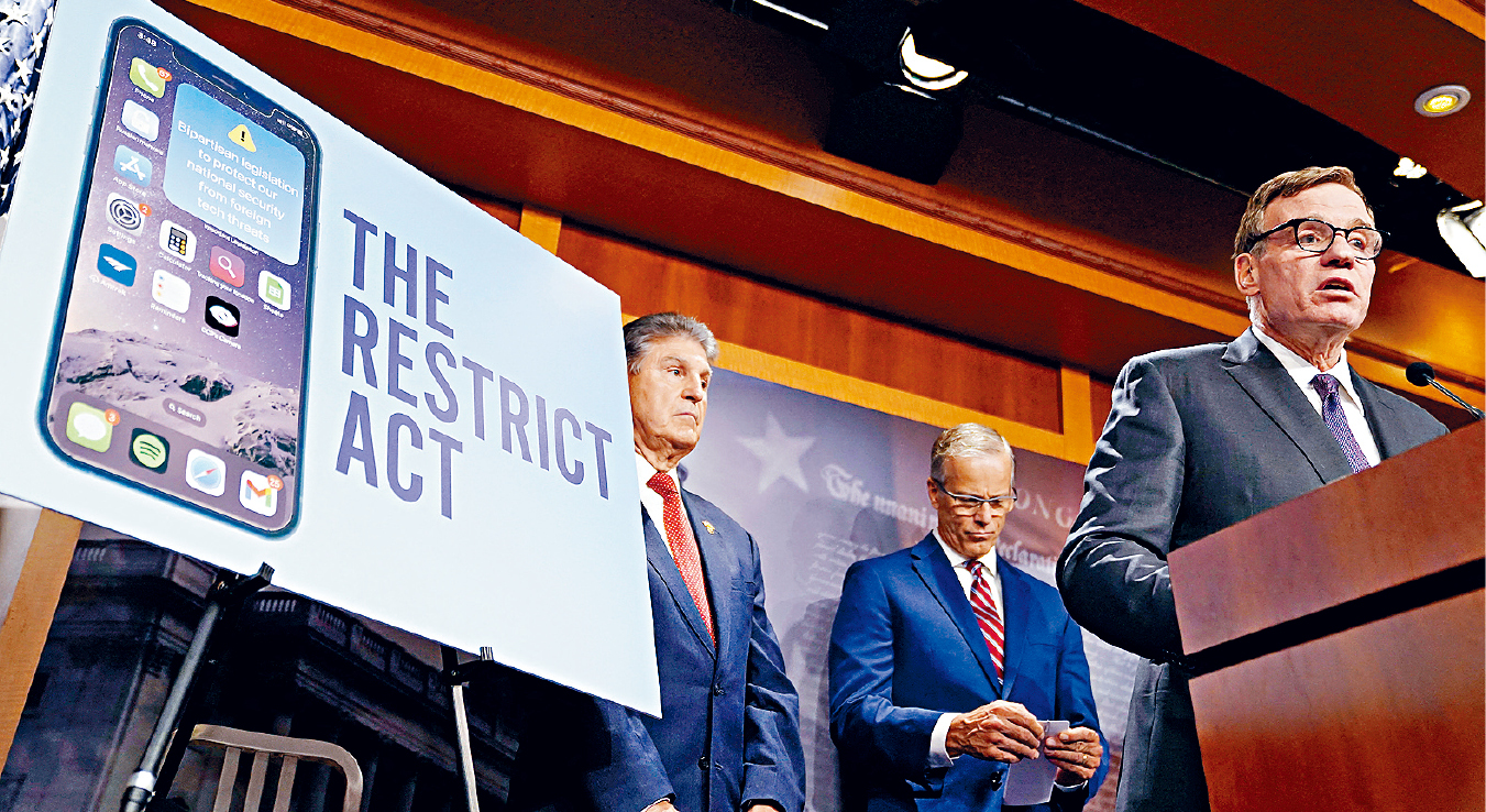 ▲参议院跨党派小组公布一项国家安全新法案,限制敌对国家向美国用户提供软件、硬件及社交平台,并授权总统禁类似抖音等技术。 图为小组负责人之一的民主党人华纳(右)。 路透社