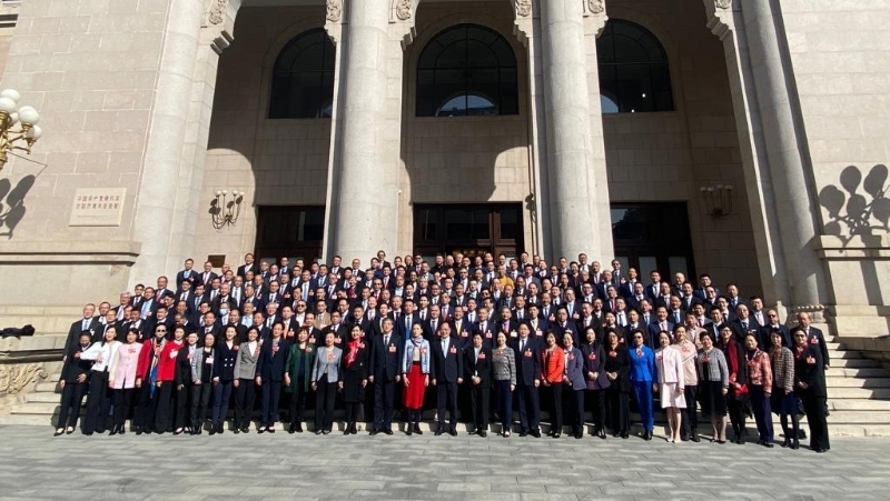 ▲全国政协委员在政协礼堂外合照。