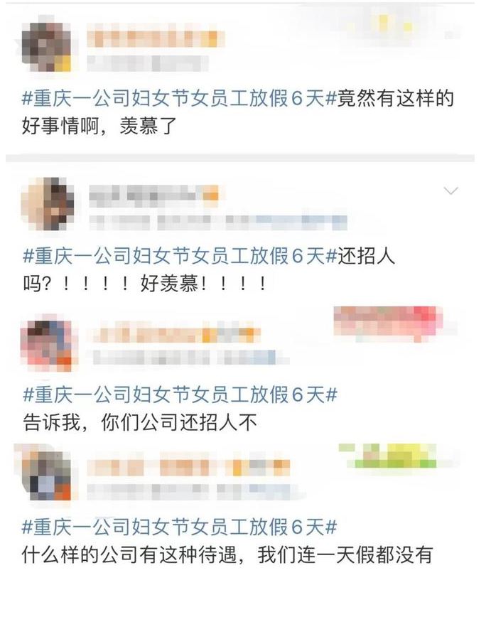 今日为三八妇女节。网传重庆一家公司在妇女节期间,全体女性员工可连放6天假期。消息引起网友广泛热议。不少网友特别是女网友,大表羡慕,有人更言:“公司还缺人吗?”该公司女员工日前向传媒确认消息。