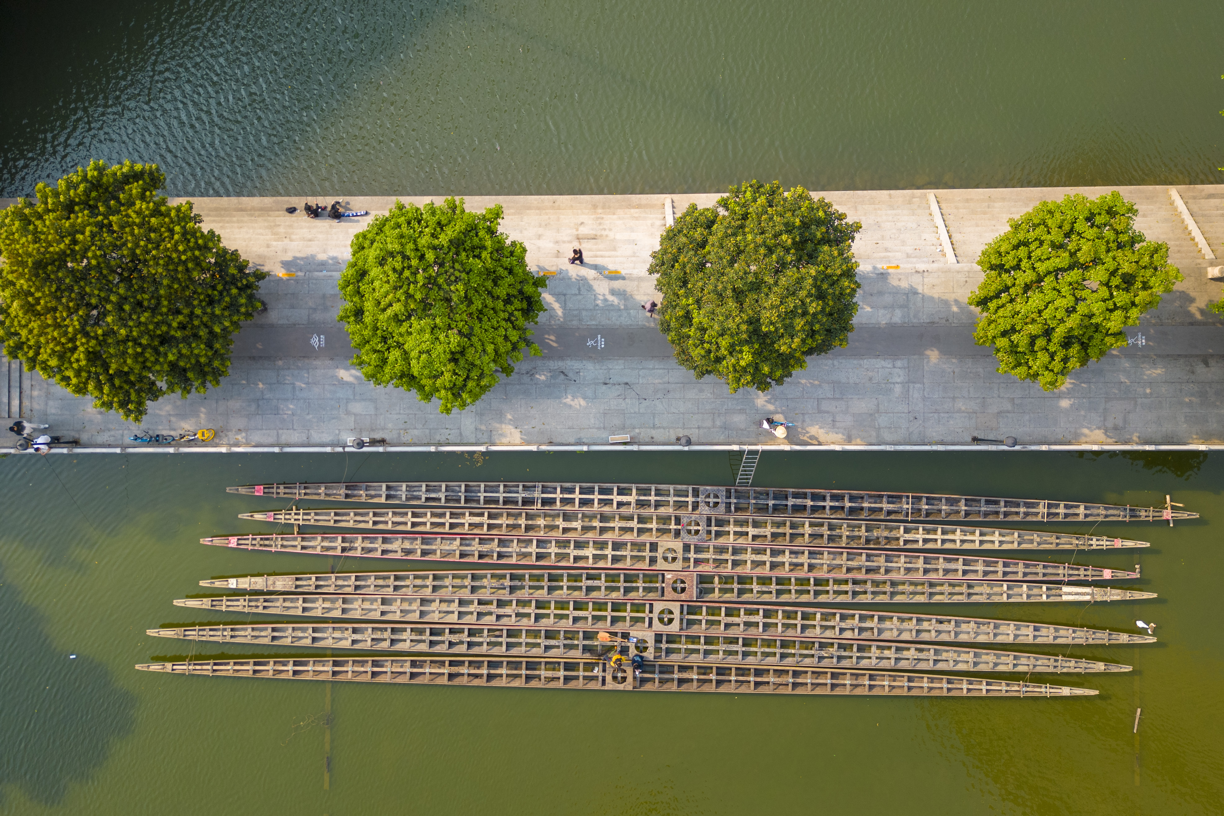 ▲猎德涌上,静待参加端午竞渡的龙舟。