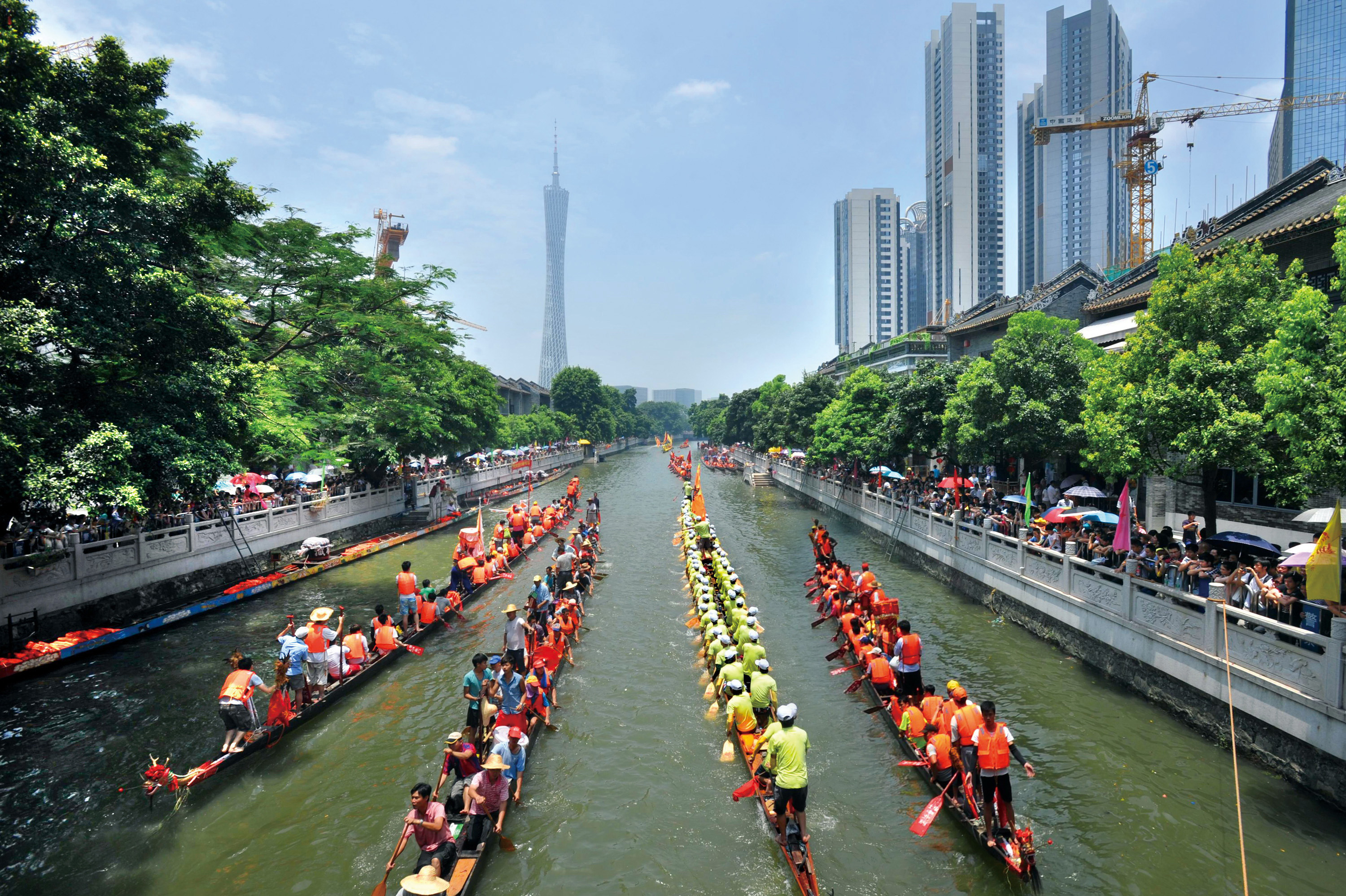 广州的龙舟文化历史悠久,但过去女子是不能登舟的。不过,猎德人早在20多年前就开了广州先河,成立了女子龙舟队。端午龙舟竞渡更是猎德的“标配”,享誉海内外。每年端午时节,很多外村龙舟来猎德“以舟会友”,一涌两岸以及珠江边人山人海,锣鼓声、爆竹声震耳欲聋,河面上龙舟竞渡,彩旗飘扬,水花四起,硝烟弥漫,场面非常热闹。2018年,猎德龙舟竞渡曾吸引近十万人前来观景。其间,不少海内外猎德人千方百计回到古村,登船竞渡,再在祠堂里吃上一顿“龙舟饭”,满满都是乡愁和记忆。“猎德人喜欢和热爱龙舟运动,这背后是一种龙舟精神:一群人就像一个人,做到‘一条船、一颗心、一个方向’,同舟共济。”陈慧君说。