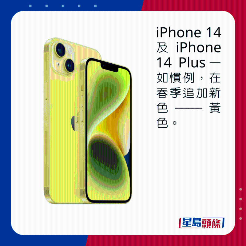 为延续产品人气,近两年Apple多会在春季为iPhone系列追加新色,今年果然也不例外,今夜官方宣布将于3月14日(二),为iPhone 14及iPhone 14 Plus追加全新的黄色机身选择,跟现有可选的5种颜色相比,这睽违已久的黄色系卖相可谓最抢眼一款,未知能否吸引果粉入手?