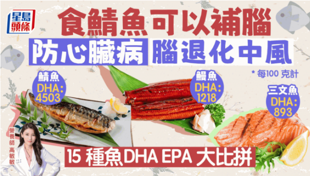 高敏敏表示,想大脑更灵活,可以进食鱼类以摄取足够的DHA和EPA。 不过,各种鱼类营养含量也不同,她列出15种鱼类的DHA和EPA含量作比较。