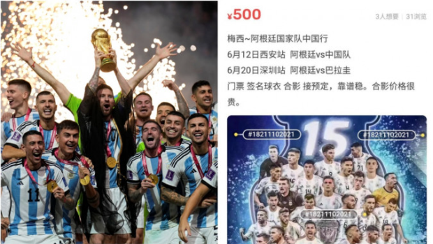 极目新闻报道,在一些二手交易平台和社交网络,有人在叫卖阿根廷国家队中国行的门票,称6月12日西安站为阿根廷队对战中国队,6月20日深圳站为阿根廷队对战巴拉圭队。部分商品售价为1999元(人民币、下同),记者私讯涉事卖家,询问1999元是订金还是门票,对方回复称价格为4.5万元。
