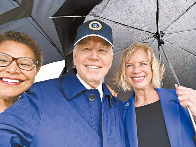 ▲美国总统拜登(中)抵达洛杉矶国际机场后,与洛杉矶市长巴斯(左)及洛杉矶县督察韩珍妮(右)自拍。巴斯市长推特
