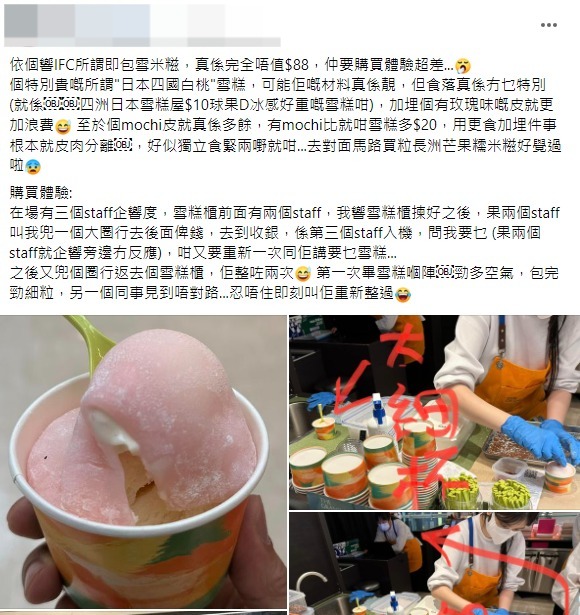 事主对该店即包雪米糍的定价颇有微言,对于定价$88港元的日本四国白桃雪糕,他直言“可能佢嘅材料真係靓,但食落真係冇乜特别”,也认为将即包雪米糍装入纸杯变相抹去了雪米糍的特色,称“用羹食加埋件事根本就皮肉分离,好似独立食紧两样嘢咁”。