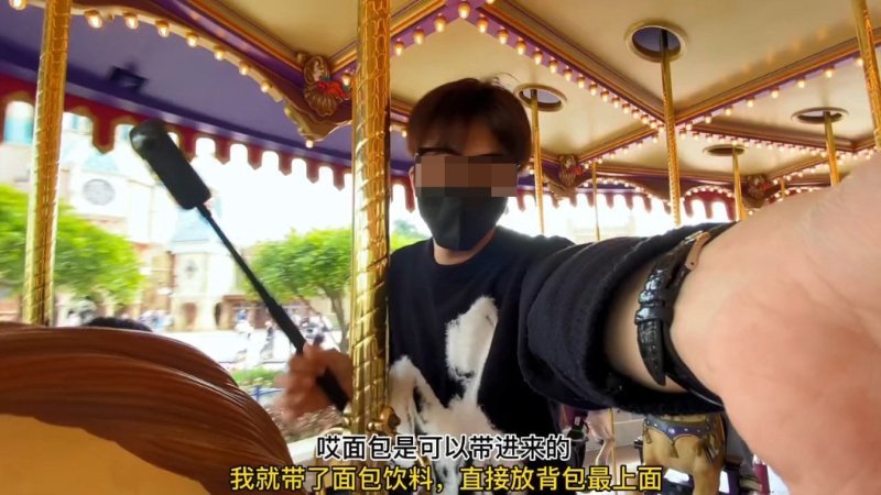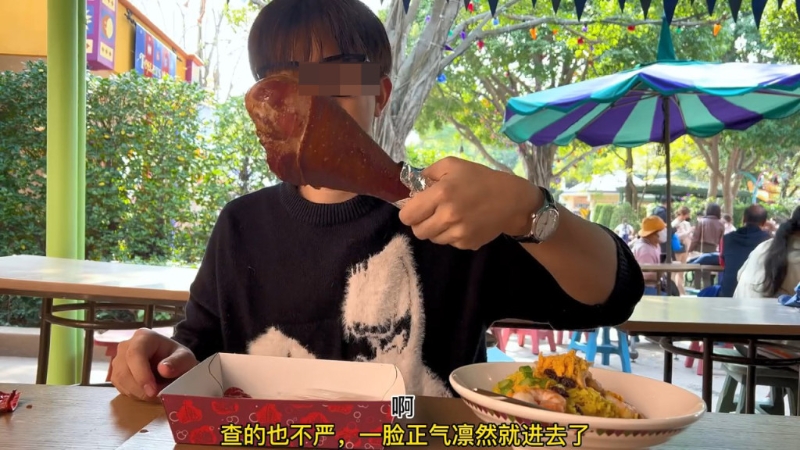 ▲“邻居小黄”又表示乐园内的食物及饮品售价高昂,故自备饮料及面包入园,“直接放背包最上面,虽然规定不能带,但是门口检查根本没管”。片中所见,“邻居小黄”花费百多元购买火鸡腿及炒饭进食,其间又饮用自己在外带入园区的汽水。