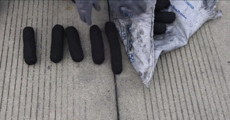 ▲毒品裹成条状,表面滚上炭渣作为掩饰,形状大小确实似炭。