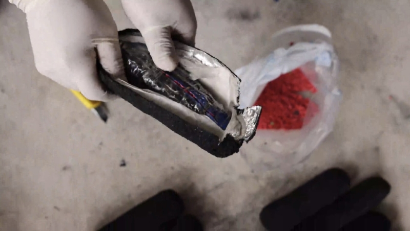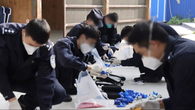 ▲执法人员拆开可疑棒状物,将毒品聚集在一起。