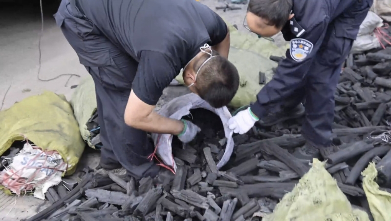 ▲缉毒人员花15小时清点了20吨炭。