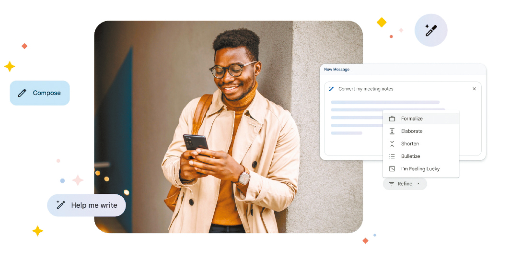 一个类似的功能将帮助用户重写或使用AI工具扩展文章。比如,谷歌Docs可以将工作会议的要点,扩展为“更精緻的摘要”,用户还可以指定语气。