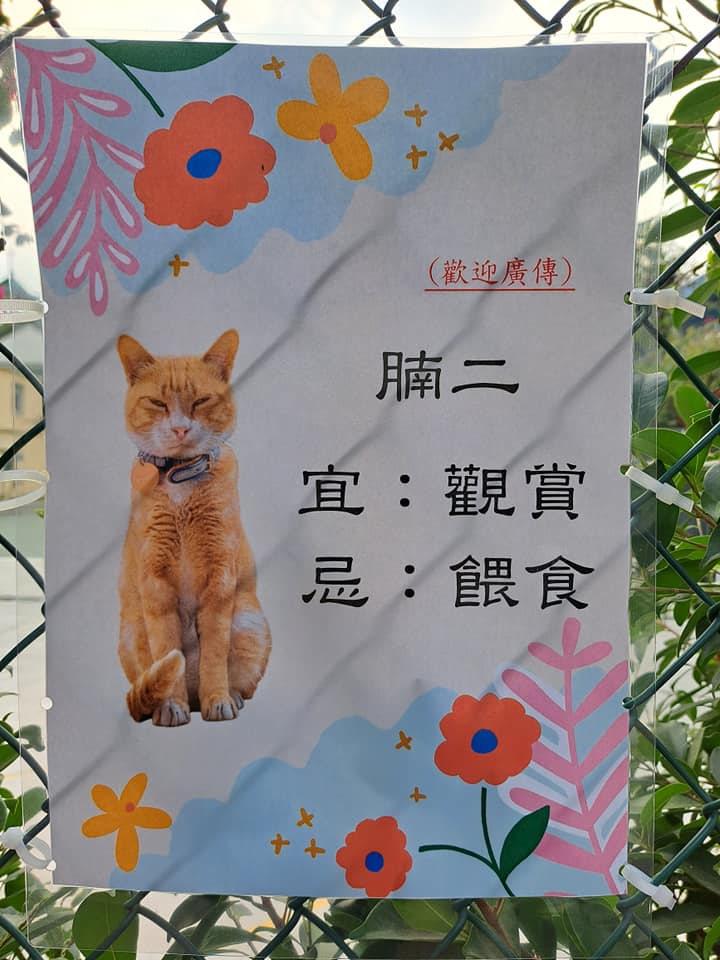 《星岛申诉王》收到有元朗街坊报料,指豪记蔬果店张贴“勿再投喂此猫”、“为它好,不喂它最好!” 街招,提醒街坊不要再喂《腩二》。 街招旁还有一张“欢迎广传”的“腩二”宜忌海报,指“宜:观赏”、“忌:喂食”。