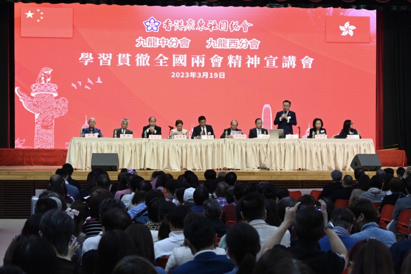 香港广东社团总会今日(19日)举行“学习贯彻全国两会精神宣讲会”分享交流会。 全国人大代表、立法会议员陈仲尼,全国人大代表陈晓峰,全国政协常委、香港广东社团总会主席龚俊龙,广东社团总会九龙西、九龙中分会负责人等均有出席。 陈仲尼致词时表示,冀香港牢牢把握大湾区发展机遇,跟随国家脚步和党中央思想的领导,大力发展经济; 陈晓峰赞扬国家精准发展经济,冀市民树立国家制度之自信。