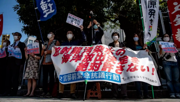 ▲活动人士抗议日本政府将福岛第一核电站核污水释放到海里的计划。英国《卫报》