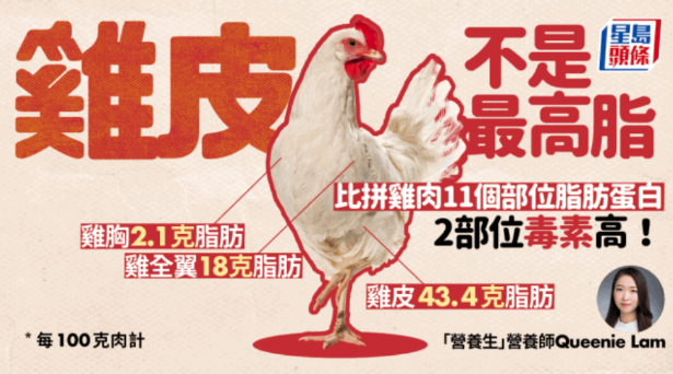 鸡皮竟然不是鸡肉最高脂部位?“营养生”(Negimen)营养师Queenie Lam指出,虽然鸡肉蛋白质丰富,但并非所有部位均含丰富营养,反而甚至易致肥、有激素毒素。她指出,鸡11个部位中,有5大高脂部位,但最高脂不是鸡皮;另有2个部位易藏毒素,不宜食用;但亦有4个部位最低脂、蛋白质高。