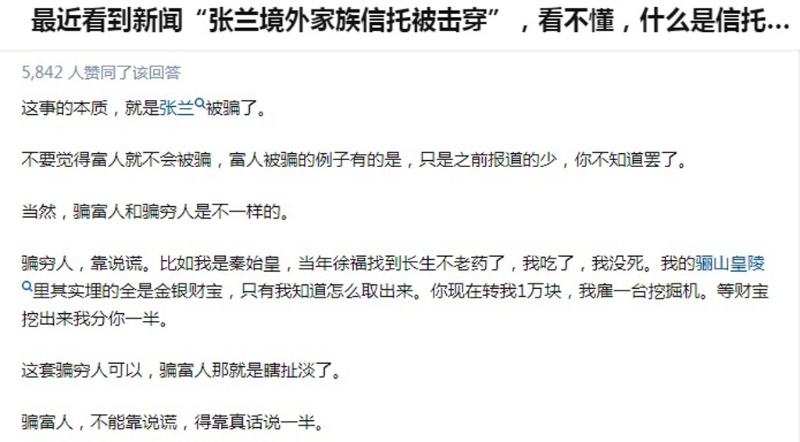 CVC注意到张兰还有家族信托,新加坡法院认定张兰是家族信托的实际所有人,因此同意CVC提出任命接管人的申请,意味着张兰将失去家族信托的管理。不少网友对金融术语不清楚,有专业网友在论坛解答称“这事的本质,就是张兰被骗了。”网友解释有两种信托,一种把钱交给机构后就没有权利干涉,就算追债也动不了这笔钱,第二种可以随意动用,推测张兰应该是被骗了,以为两者优点是同一种信托,“说白了不是信托的问题,也不是张兰的问题,而是卖信托产品的人的问题”。