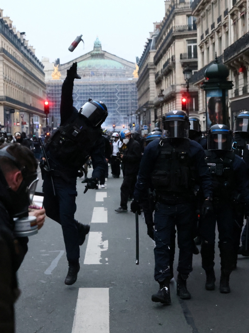 ▲法国退休改革引发的全国示威进入第9天,巴黎歌剧院附近一名防日暴警员投掷催泪弹。 路透社